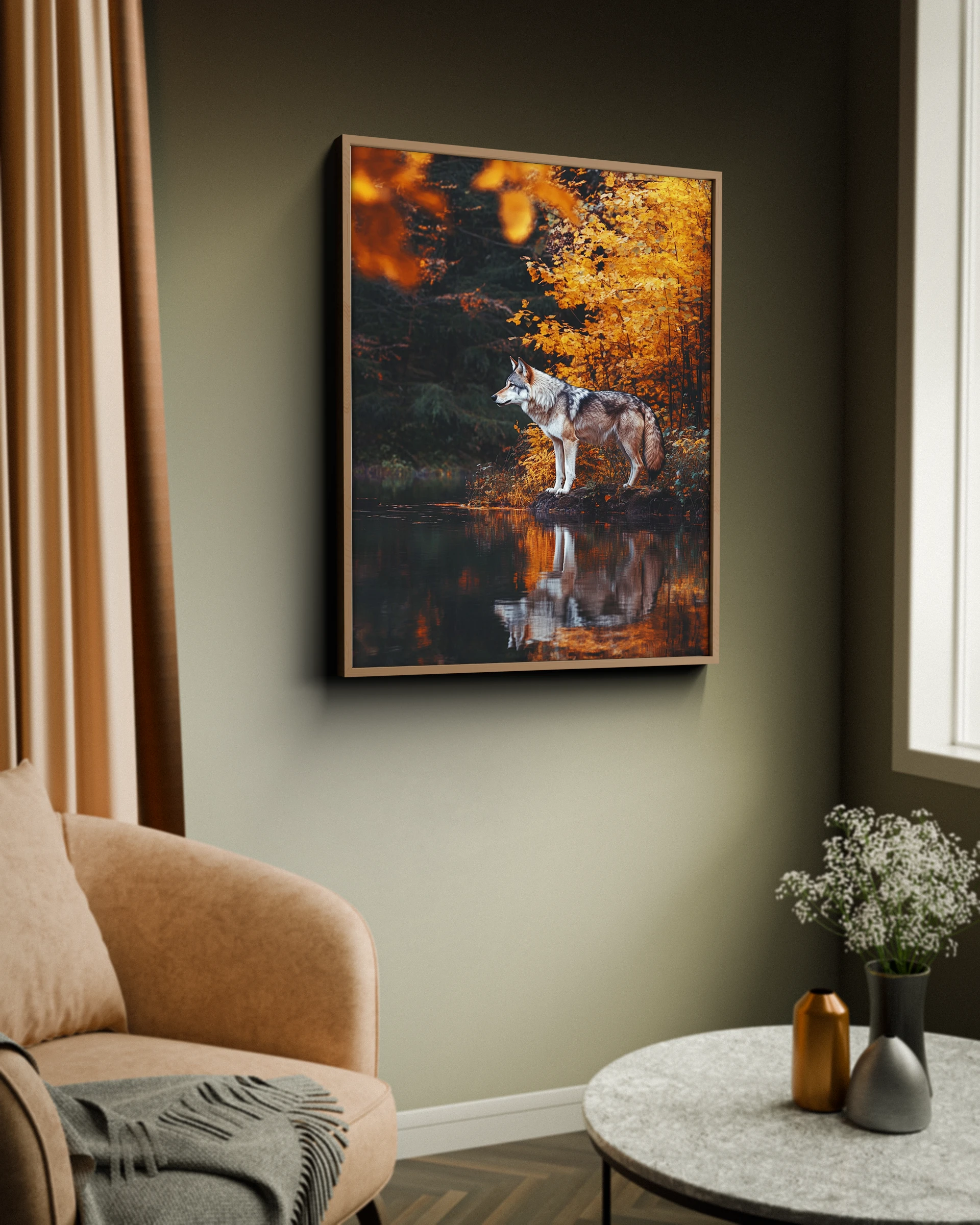 Odkryj zachwycający obraz „Jesienne myśli”, przedstawiający wilka stojącego nad jeziorem w jesiennym lesie. Fotorealistyczne, kinowe ujęcie z boku, utrzymane w stylu fotografii National Geographic, przeniesie Cię w sam środek dzikiej przyrody. To wyjątkowe dzieło, stworzone dzięki sztucznej inteligencji, wprowadzi do Twojego wnętrza atmosferę jesiennego spokoju.
