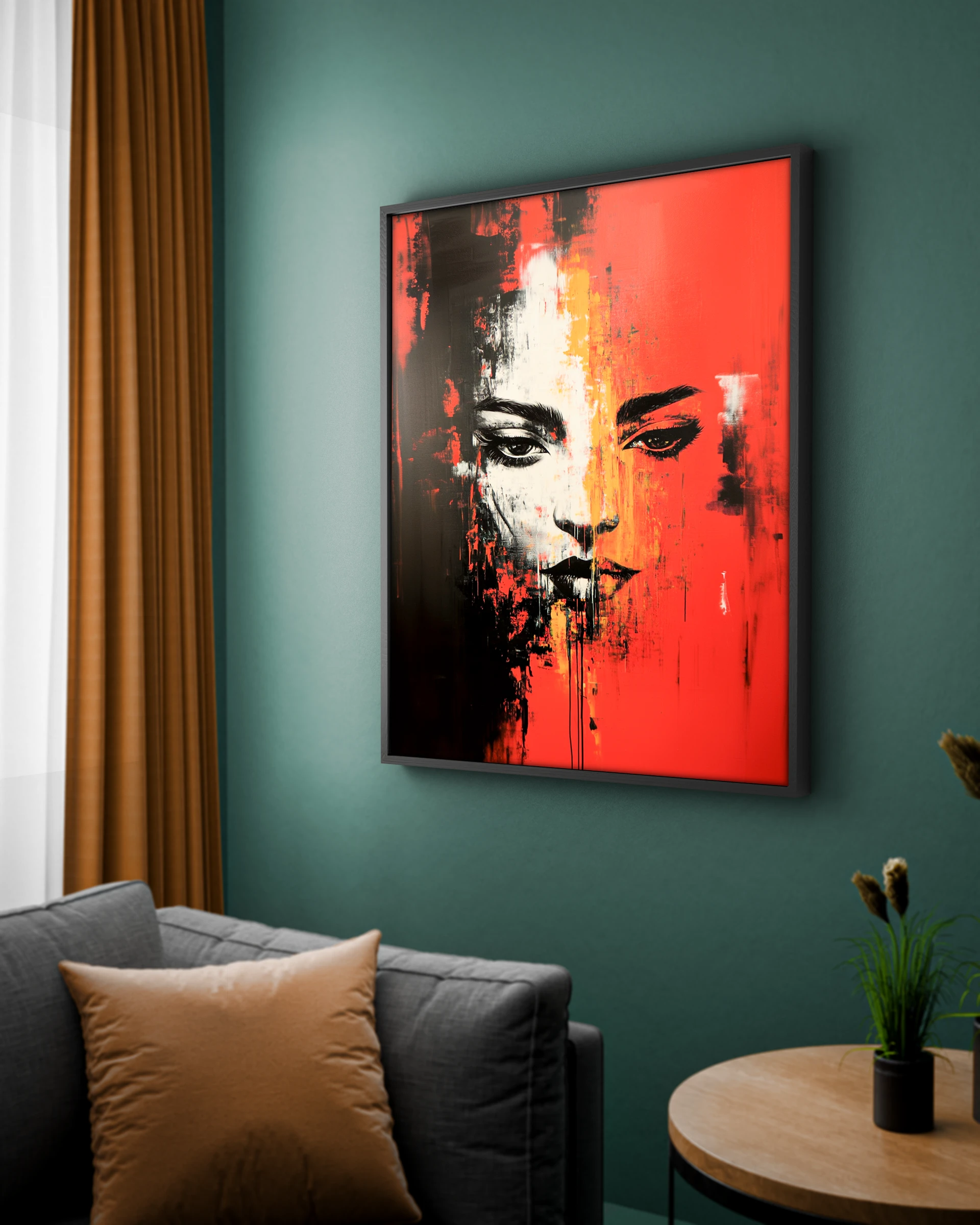 Intensywny i pełen emocji obraz zatytułowany ’Oszust’, przedstawiający enigmatyczną twarz na tle kontrastowych barw czerni, czerwieni i pomarańczu. Rozmyte linie i niedopowiedzenia oddają dwuznaczność i iluzję, prowokując widza do zastanowienia się nad tym, co jest prawdziwe, a co tylko maską.