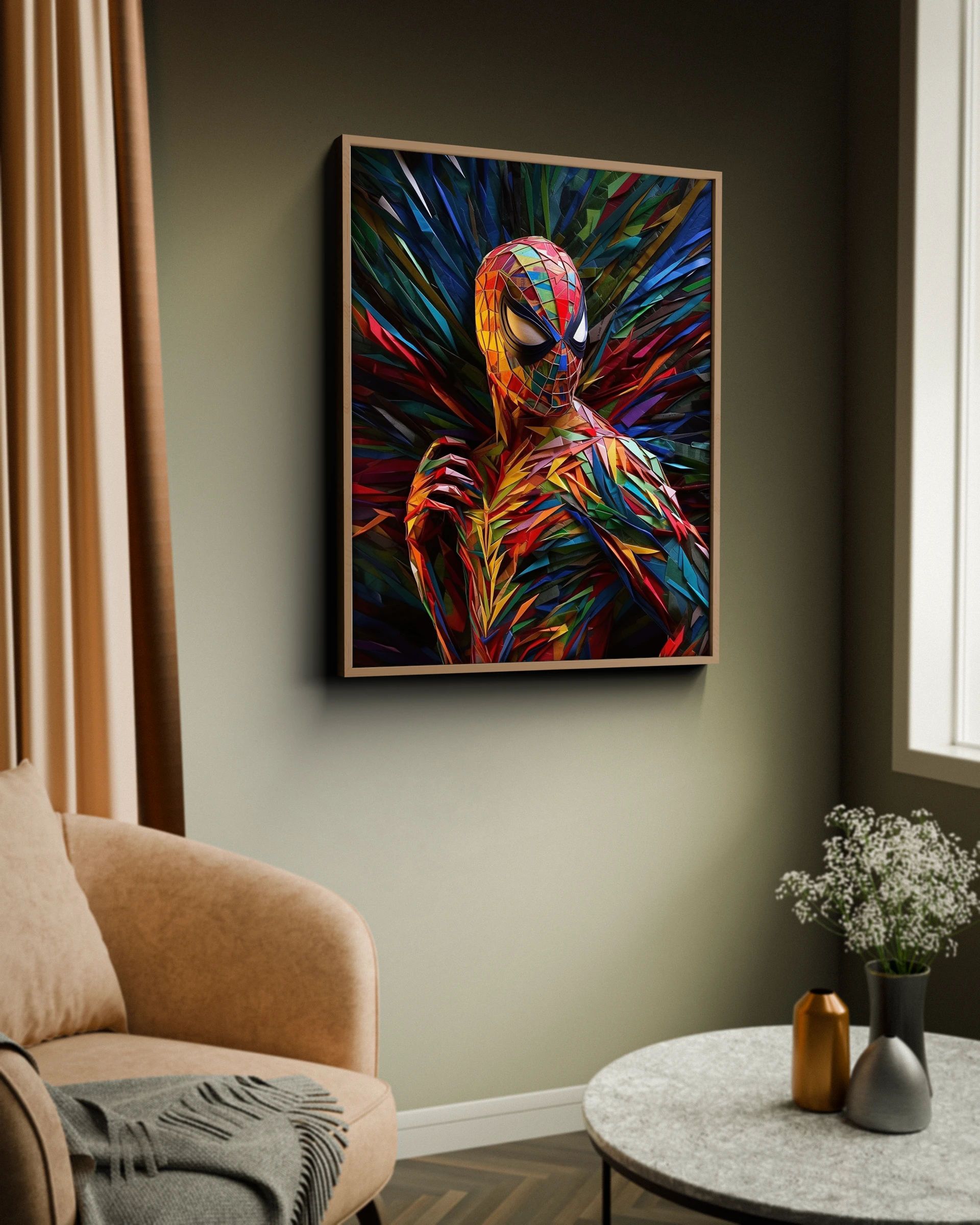 Odkryj niezwykły obraz, na którym Twój ulubiony superbohater został stworzony z kolorowych kawałków papieru. To pełne energii dzieło, wygenerowane dzięki sztucznej inteligencji, doda dynamizmu i wyjątkowego charakteru każdemu wnętrzu.