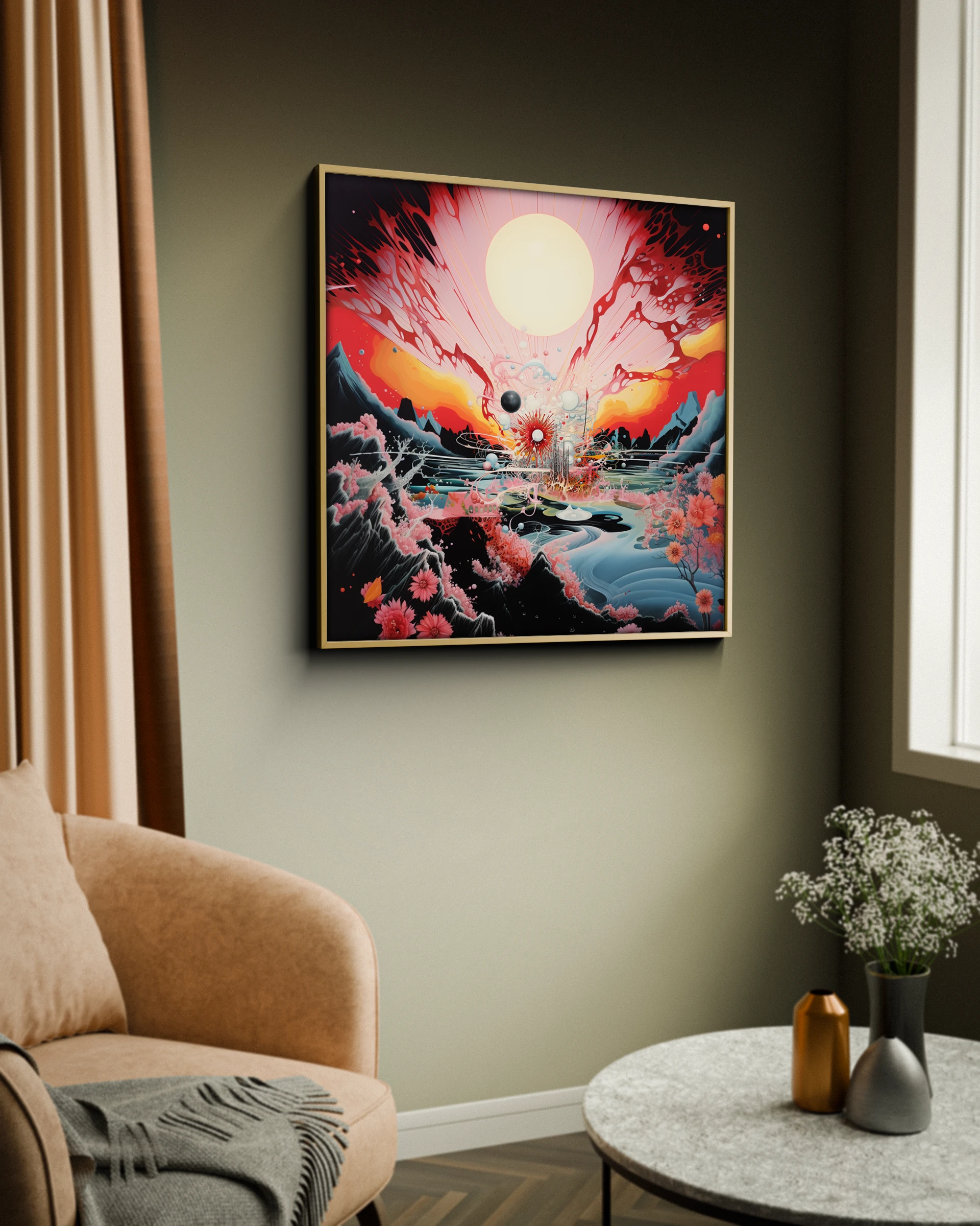 Abstrakcyjny obraz ukazujący eksplozję kolorów i energii. Surrealistyczne formy łączą naturę z kosmiczną dynamiką. Doskonały dla tych, którzy szukają sztuki pobudzającej wyobraźnię i inspirującej do refleksji.